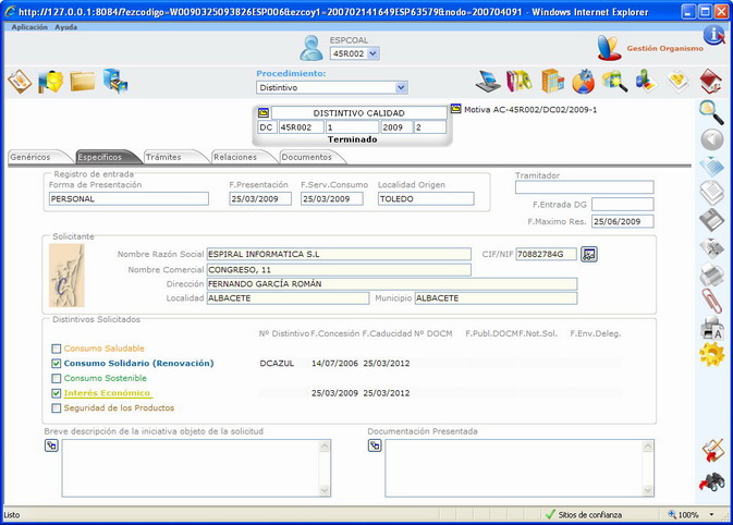 DC99. CONSULTA FICHA COMPLETA. UTILIDAD: Este proceso se usa para visualizar los datos completos de una Solicitud de Distintivo de Calidad. ACCESO AL PROCESO: Se accede al proceso mediante el árbol de procesos que aparece en el menú de procesos después de la realización de la búsqueda de la Solicitud o haciendo click sobre el listado resultante de una búsqueda de expedientes.