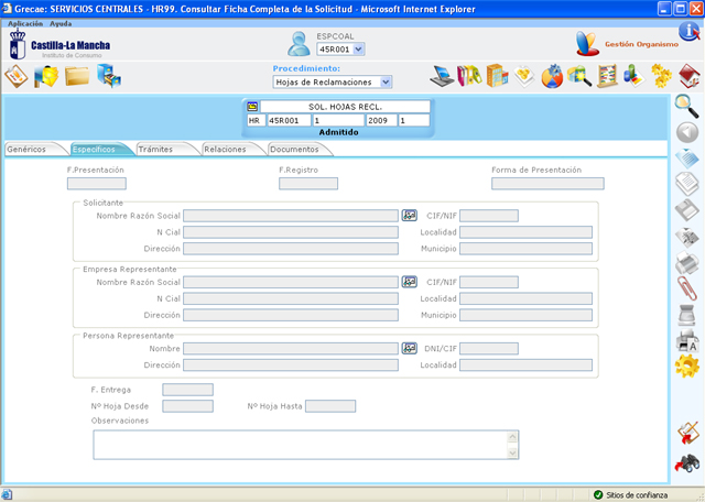HR99. CONSULTAR FICHA COMPLETA DE LA SOLICITUD. UTILIDAD: Este proceso se usa para visualizar los datos completos de un expediente de solicitud de hojas de reclamaciones. ACCESO AL PROCESO: Se accede al proceso mediante el árbol de procesos que aparece en el menú de procesos después de la realización de la búsqueda de la consulta o haciendo click sobre el listado resultante de una búsqueda de expedientes.
