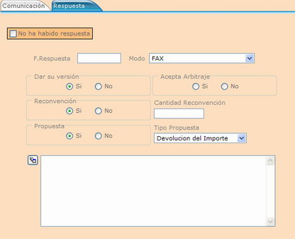 En esta pantalla el usuario deberá marcar las opciones de respuesta dadas para realizar la Respuesta. Indicador respuesta {No ha habido respuesta} Indicador de si ha habido o no respueta a la comunicación Fecha de la Respuesta {F.Respuesta}. |