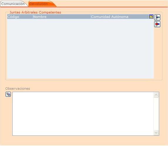 Juntas Arbitrales Competentes: Se deben indicar las Juntas Arbitrales a las que compete la solicitud. Se pueden agregar tantas como se desee. Si se indica una sola, la aplicación preguntará al usuario si desea hacer el tramite de comunicación automaticamente. En la pestaña de comunicación se podrá seleccionar la carta a enviar al Reclamante para notificarle el traslado de expediente. Observaciones: Texto libre para escribir cualquier observación. |