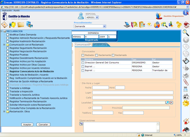 2.14 REGISTRAR CONVOCATORIA ACTO DE MEDIACIÓN. UTILIDAD: Este proceso permite convocar a determinados agentes (reclamante,gestor...) que forman parte del procedimiento a un acto de mediación. ACCESO AL PROCESO: Se accede al proceso mediante el árbol de procesos que aparece en el menú de procesos después de la realización de la búsqueda de expedientes o mediante la operación de procesos de la barra de operaciones una vez registrada una Reclamación.