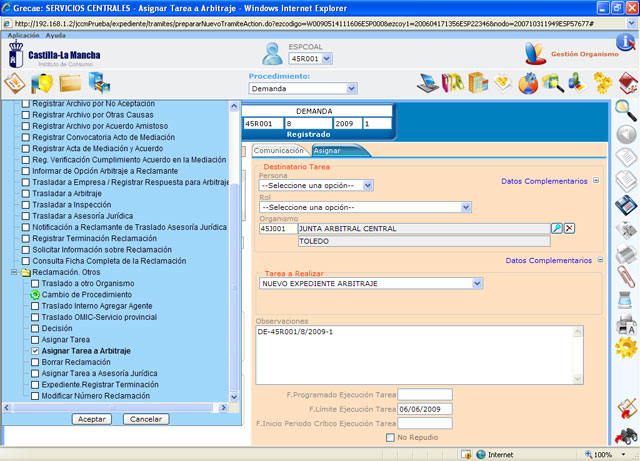 2.32 ASIGNAR TAREA A ASESORIA JURÍDICA. UTILIDAD: Este proceso permite asignar una tarea a la Asesoría Jurídica y por defecto será el levantamiento de un expediente sancionador motivado por la reclamanción en curso. ACCESO AL PROCESO: Se accede al proceso mediante el árbol de procesos que aparece en el menú de procesos después de la realización de la búsqueda de expedientes o mediante la operación de procesos de la barra de operaciones una vez registrada una Reclamación.
