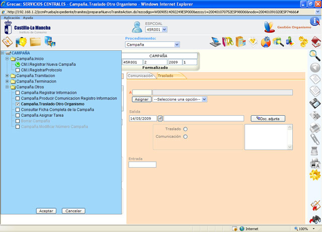 2.11 TRASLADO OTRO ORGANISMO. UTILIDAD: Este proceso permite realizar un traslado del expediente a otro organismo del sistema. ACCESO AL PROCESO: Se accede al proceso mediante el árbol de procesos que aparece en el menú de procesos después de la realización de la búsqueda de expedientes o mediante la operación de procesos de la barra de operaciones una vez registrada una Reclamación.